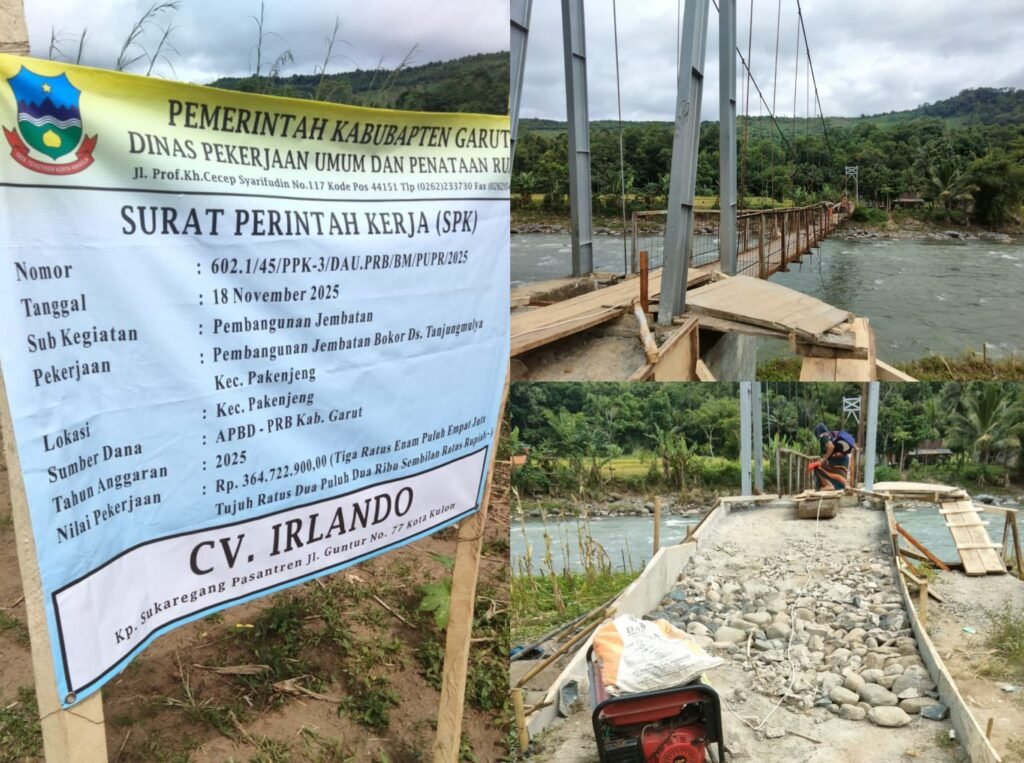 Garut, Citra-Nusa.My.Id – Pembangunan Jembatan Bokor di Desa Tanjungmulya, Kecamatan Pakenjeng, Kabupaten Garut, menuai sorotan tajam dari masyarakat. Proyek yang dilaksanakan berdasarkan Surat Perintah Kerja (SPK) Dinas Pekerjaan Umum dan Penataan Ruang (PUPR) Kabupaten Garut Nomor 602.1/45/PPK-3/DAU.PRB/BM/PUPR/2025, tertanggal 18 November 2025, dengan nilai kontrak Rp364.722.900, diduga tidak dikerjakan sesuai spesifikasi teknis.” Kamis 4 Desember 2025
